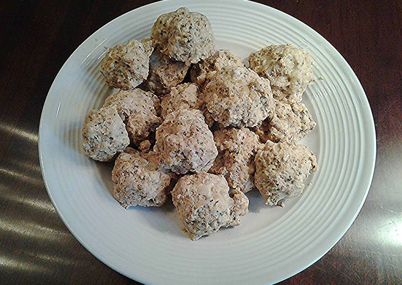 - Form meat mixture into 1 to 1 1/2 inch balls, lay in single layer on baking sheet. Pour warmed broth around them, cover loosely with foil. Bake 18 to 25 minutes just until cooked through..
