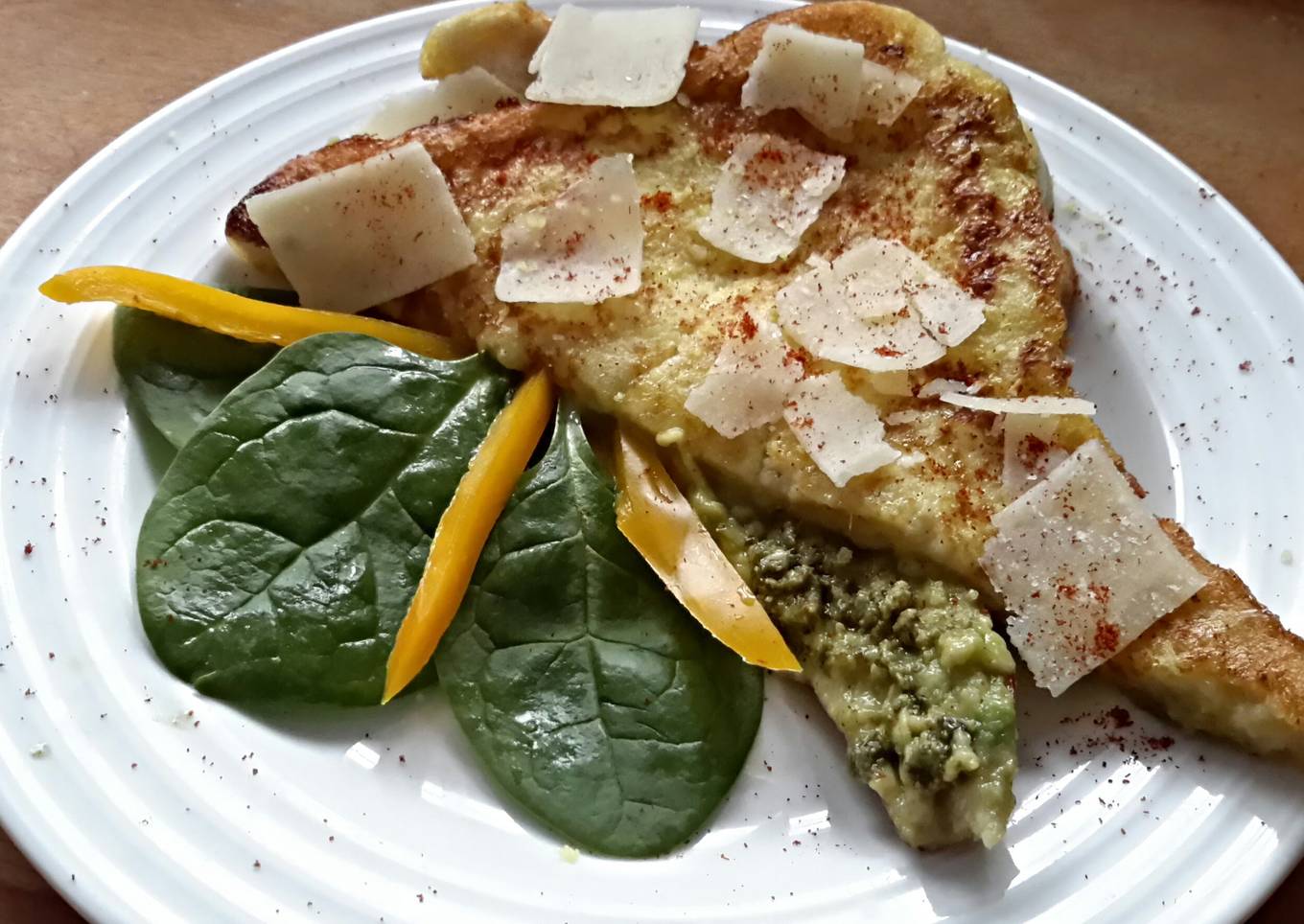 - Mix the egg and milk. Spread the bread first with pesto, than the avocado cream an a few slices of the goats cheese or brie, top wit a slice of bread