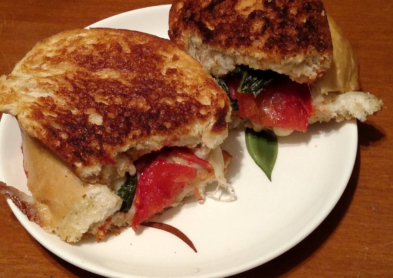 - Brush bread with olive oil. Place oiled side of bread down in a skillet. Top with two basil leaves. Place tomatoes on basil leaves. Top with mozzarella cheese. Brush another slice of bread with oil. Place bread oiled side up on top of cheese.