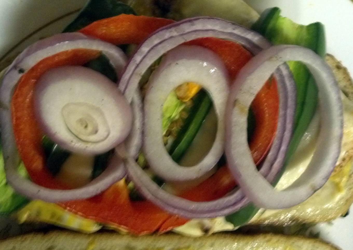 - remove bread and vegetables at the same time and place cheese on your chicken. prepare your bread with mayonnaise and spicy mustard then transfer chicken from grill to your bread and stack on your JalapeƱos, red bell pepper and onion