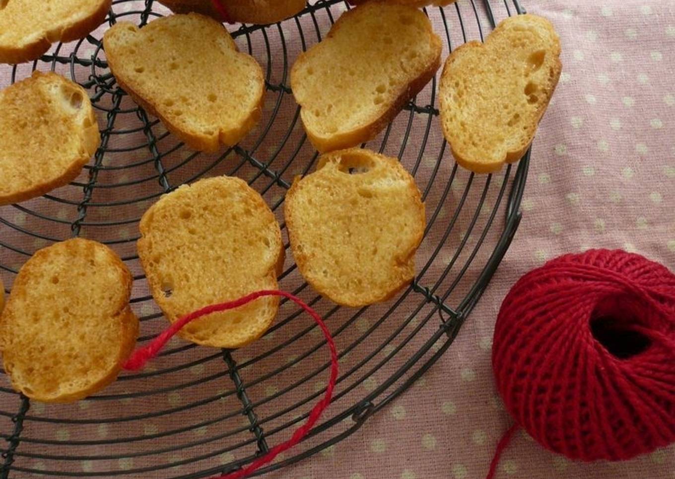 - Slice the bread thinly (5-7 mm). Preheat the oven to 110℃ and toast for 15 minutes.