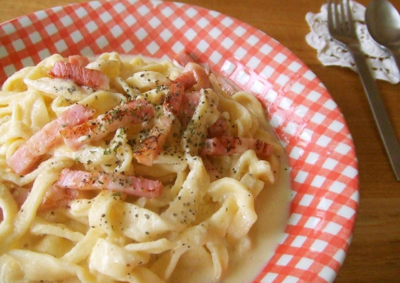- Cook the pasta in plenty of hot water with salt (not listed). Cooking time should be about 2 minutes. Adjust the cooking time as it depends on the thickness of the noodles.