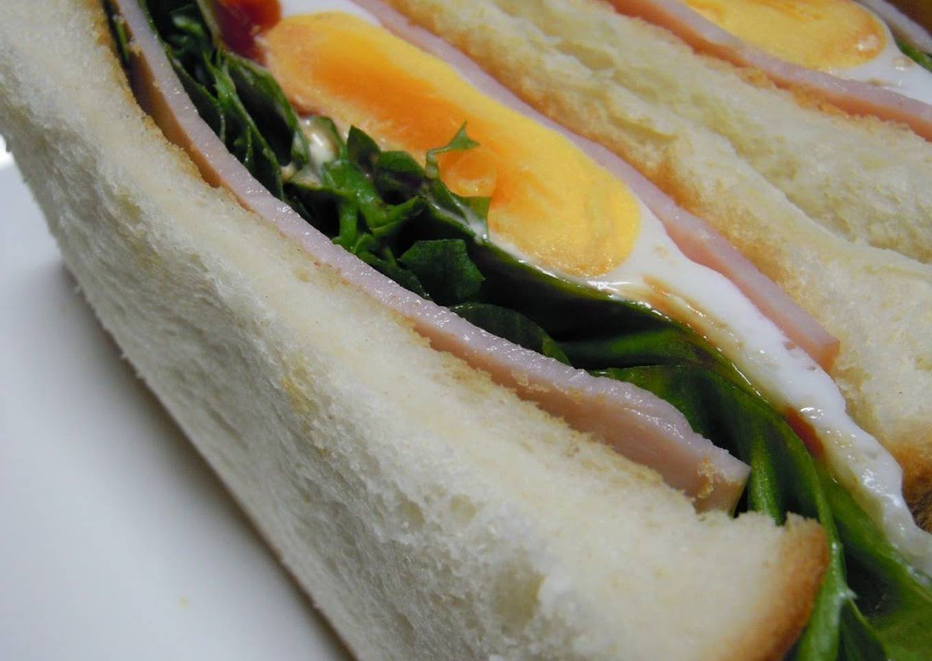 - Put the ham, fried egg, mayonnaise, ketchup, lettuce and ham in that order between the bread slices, then lightly press the sandwich together.
