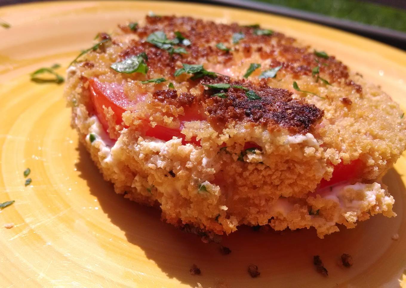 - Place flour and bread crumbs in separate shallow bowls. In another bowl whisk egg and milk. Coat the top and bottom of each tomato sandwich with flour, then dip in egg mixture, then coat with breadcrumbs