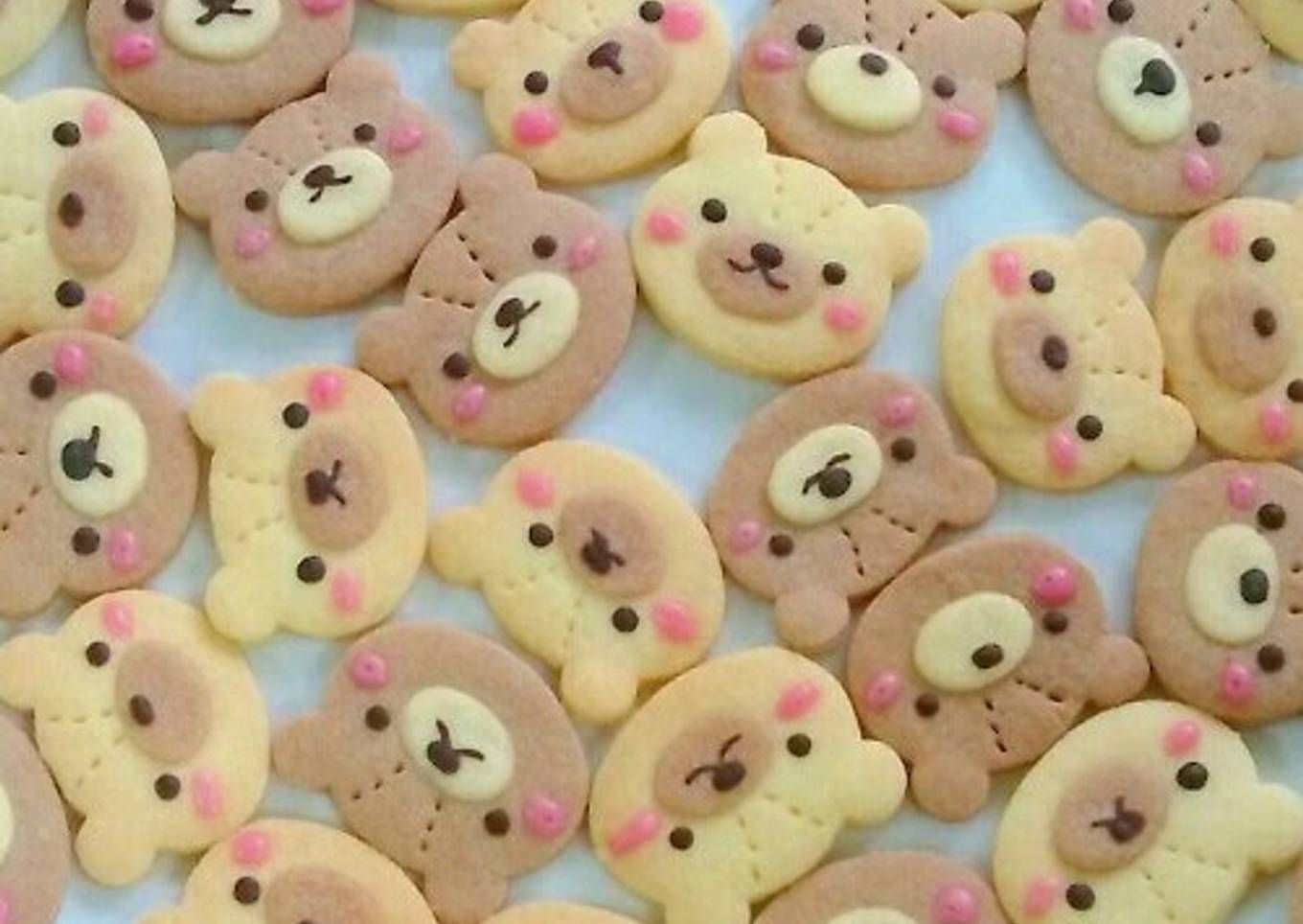 - Sandwich the one of the dough in two sheets of plastic wrap and roll it out to 5 mm thick. Cut into bear shapes using a cookie cutter. Leave the other half of the dough in the refrigerator.